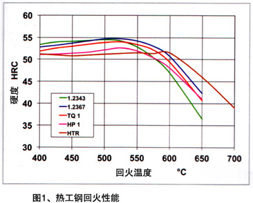圖表不僅是壓鑄模具熱處理時一個重要的工作方法,而且也對熱工鋼正確選擇有幫助。這樣的圖表明的是由于加熱鋼的硬度變化。圖1,是所介紹鋼的回火曲線,在此曲線圖上,德國使用較少的1.2344鋼未列上去。除了HTR鋼,所列鋼種在500——550度之間回火溫度下表現(xiàn)有顯明的二次硬度最大值。隨著回火溫度繼續(xù)增加,硬度下降。由曲線下降坡度可以推斷回火穩(wěn)定性?;鼗鹎€下降越陡,鋼的回火穩(wěn)定性越小,在澆注作業(yè)中鋼的加熱反應(yīng)越敏感。與1.2343鋼相比,此曲線證明1.2367鋼有較好的回火穩(wěn)定性,在550度之上回火溫度技術(shù)范圍,TQ1和HP1達(dá)到幾乎與1.2367一樣的回火穩(wěn)定性。特種鋼HTR由于其高的鎢含量表現(xiàn)出較其余鋼明顯高的回火溫度。二次硬度最大值不僅在約70度時移至較高的回火溫度,在此最大值之上溫度時曲線也降得比較小。